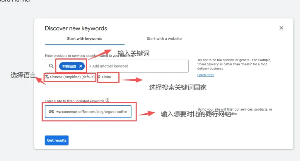 • 首先输入关键词:输入描述你业务的核心词(例如“有机咖啡”),可以同时输入多个词,用逗号分隔(如“有机咖啡, 公平贸易咖啡”)。