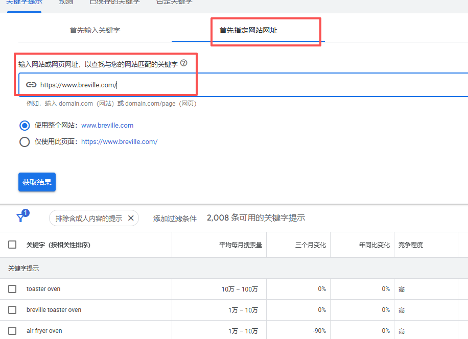 • 在“发现新关键词”中,选择“首先指定网站网址”。