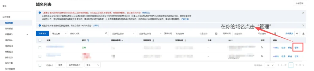 注意:必须复制,不能手打!登录阿里云控制台,搜索“域名列表”,找到你的域名,点击“管理”。